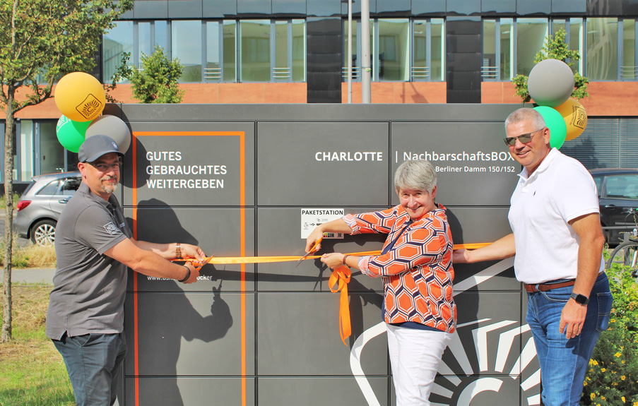 Gemeinsam für Null Verschwendung: Die Berliner Stadtreinigung (BSR) und die Charlotte haben gestern in Berlin-Adlershof eine innovative NachbarschaftsBox eröffnet (im Bild v.l.n.r.: Carsten Röding, Stephanie Otto, Vorstandsvorsitzende BSR, und Dirk Enzesberger). Bewohner der Charlotte können hier kostenlos Schließfächer nutzen – zum Beispiel, um ausrangierte, gut erhaltene Gegenstände zur Weiternutzung an Interessierte abzugeben. Mit dem anbieteroffenen Service wollen die Kooperationspartner den Standort aufwerten, und ein bürgernahes Angebot für Abfallvermeidung anbieten und den nachhaltigen Umgang mit Ressourcen fördern.
