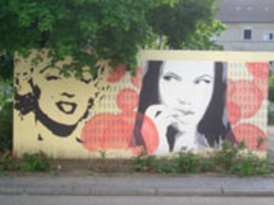 Nach Abschluss der Sanierung unserer Wohnanlage im Falkenhagener Feld in Spandau gestaltete der Kunst-Leistungskurs die Giebelwände der Garagen am Wittgensteiner Weg. Als Vorlage dienten Fotos der Bewohner von ihren „Lieblingen“, die dann im Stil der 1960er Jahre verfremdet auf die Wände kamen.