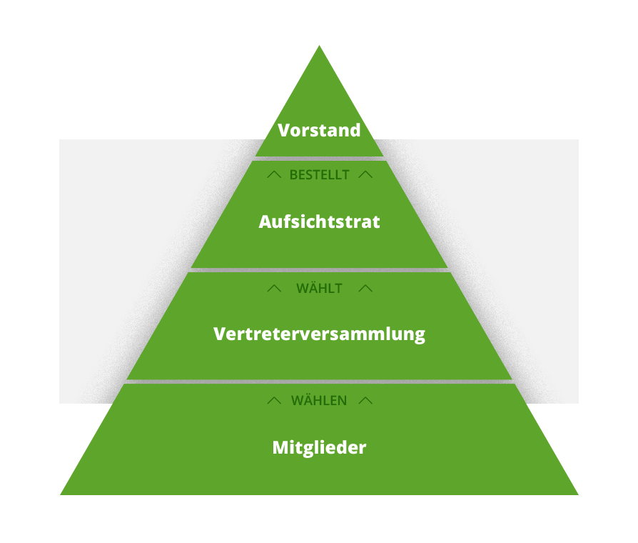 An erster Stelle stehen dabei die Mitglieder, die ihre Vertreter wählen. Diese wiederum wählen in der Vertreterversammlung den Aufsichtsrat. Letzterer bestellt den Vorstand, der die Geschäfte der Genossenschaft führt..