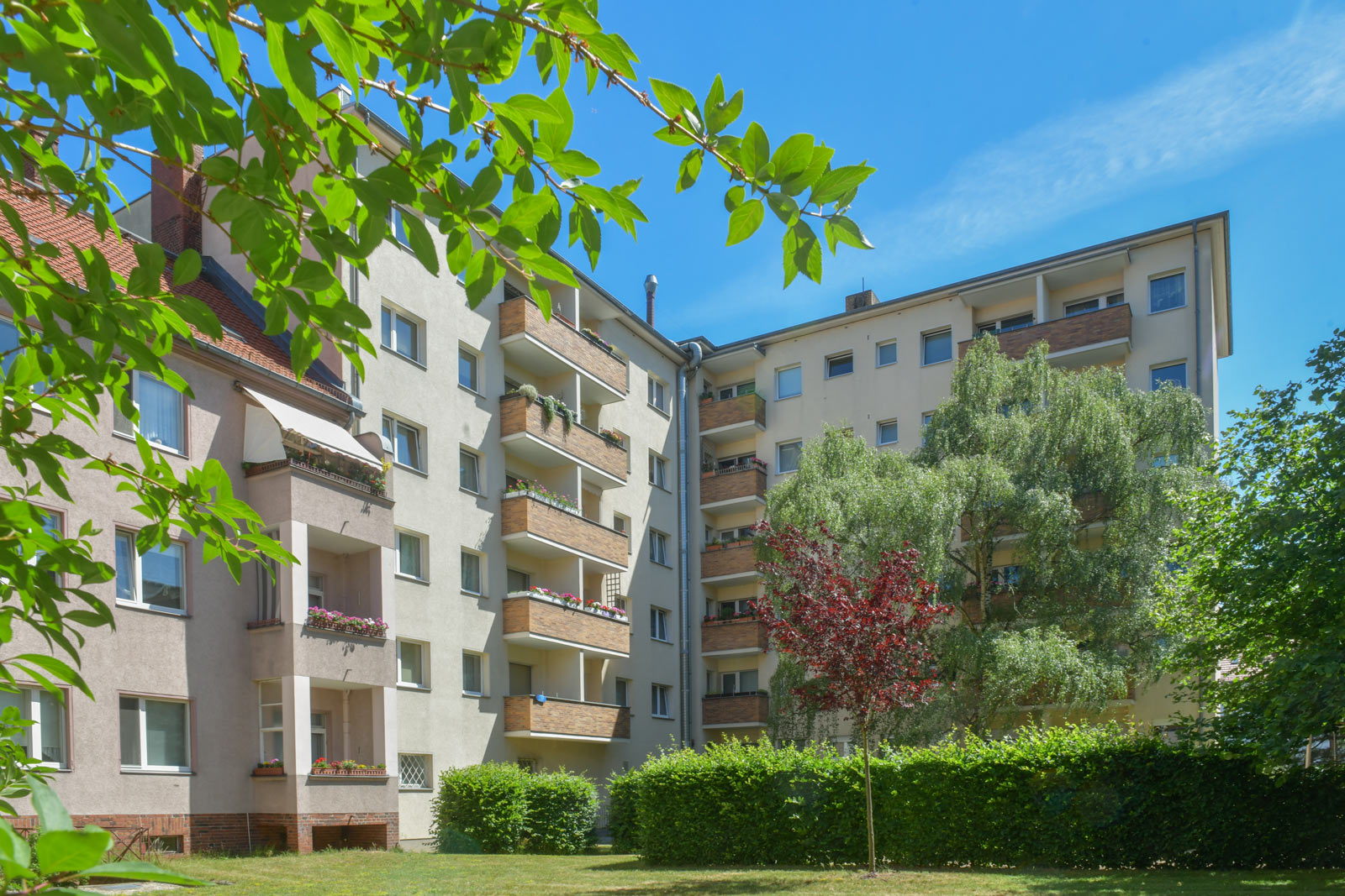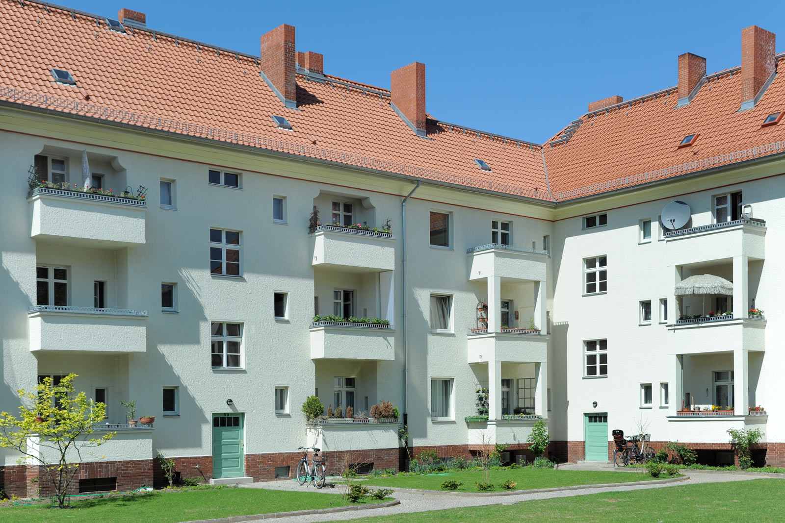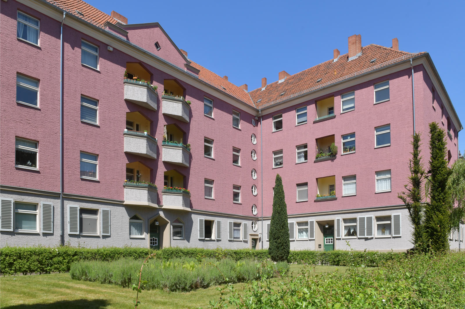 Ganz in der Nähe der Borsighallen und des Kurt-Schumacher-Platzes (verkehrsgünstig an den gleichnamigen U-Bahnhöfen der Line U6 gelegen) bewirtschaftet die Charlotte ihren zweitgrößten Bestand in Berlin: Ein Großteil der Wohnanlagen wurde und wird aufwendig und denkmalgerecht modernisiert - repräsentative Bauten mit einer imposanten Fassadengestaltung.