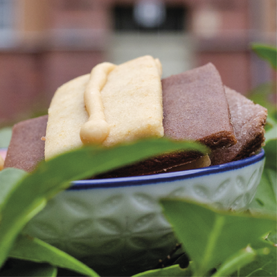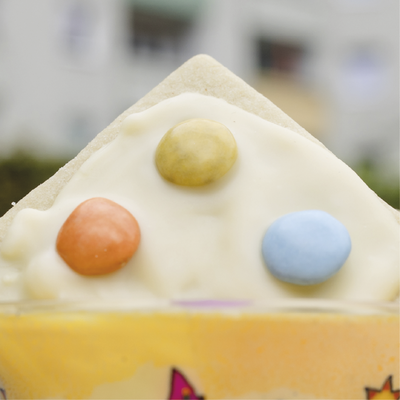 Bunt verspielt lachen einem die Balkons entgegen. Das zarte Grün der Fassade strahlt sanfte Wärme aus. Hier zu wohnen verheißt Freude allein beim Anblick des Nachhausekommens zu verspüren. Die klaren Formen versprechen Orientierung und finden sich in der quadratischen Keksform wieder. Was lag näher, als der Verspieltheit mit Mini-Smarties Ausdruck zu verleihen? Genau dafür steht auch die weiße Schokolade, allerdings ein bisschen sanfter und mit der Wärme der Pistazie wird der Keks rund – oder vielmehr quadratisch.