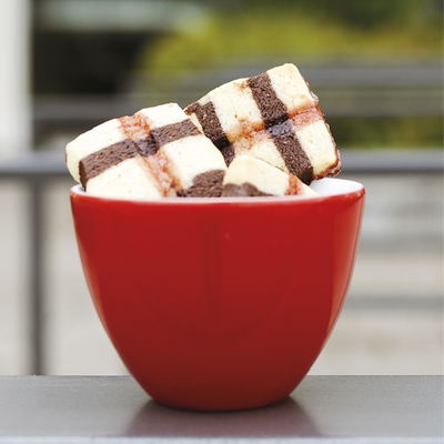 Die geraden Linien des Groß-Berliner Damms in den Farben von Schneewittchen: Rot, Weiß und Schwarz vermitteln Klarheit, aber auch einen Hauch von Exklusivität. Diese findet geschmacklich seinen Ausdruck in dem Schwarz-Weiß-Gebäck durch die Tonka-Bohne. Dezent und doch besonders gibt sie dem Keks einen Hauch von Anmut. Wie auch die leichte Spur von Sauerkirsche die Eleganz der Gebäude im Geschmack wiederspiegelt.