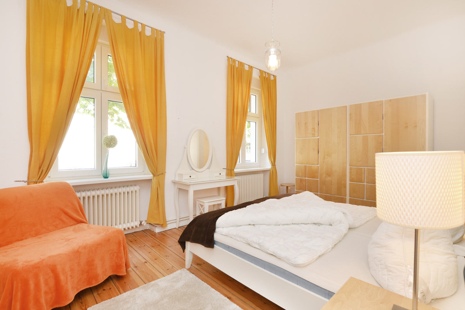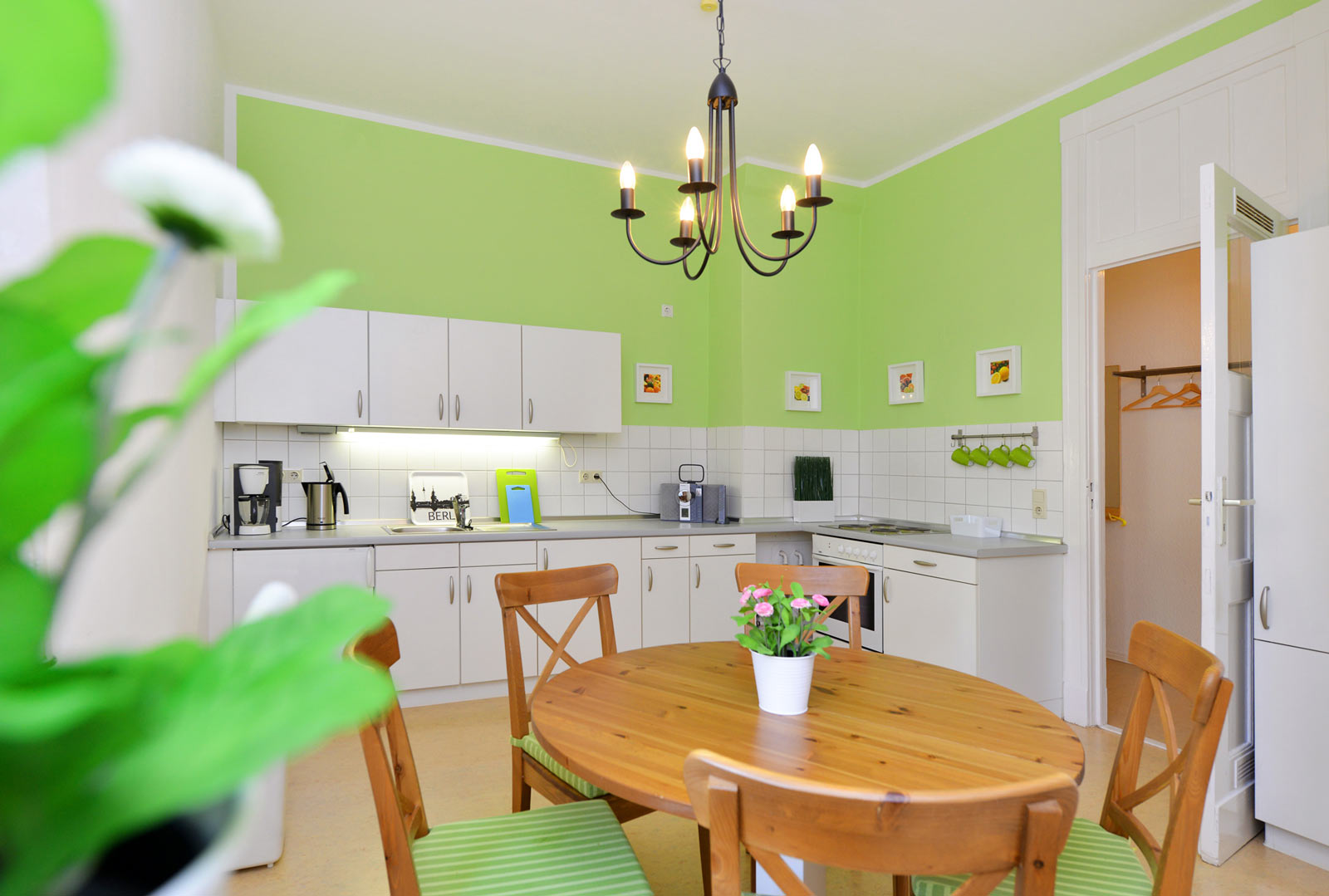 Die größere unserer beiden Spandauer Gästewohnungen bietet für Sie oder Ihre Gäste auf ca. 64 m² einen gemütlichen Wohnbereich mit Fernseher, ein Schlafzimmer, ein Duschbad und eine große Einbauküche. In der Küche befinden sich eine Stereo-Anlage, eine Kaffeemaschine, ein Wasserkocher und ein großer Esstisch. Schlafmöglichkeiten bestehen im Schlafzimmer in einem Doppelbett, auf einer Schlafcouch im Wohnbereich und auf einem Schlafsessel. Handtücher und Bettwäsche sind nicht vorhanden. Jetzt neu: inklusive WLAN!